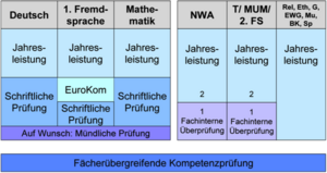 In den Kernfächern NWA (Naturwissenschaftliches Arbeiten - bestehend aus den Fächern Physik, Chemie, Biologie) und im Wahlpflichtfach (Mensch und Umwelt, Französisch, Technik oder 2. Fremdsprache) wird eine fachinterne Überprüfung im Rahmen des Regelunterrichts abgelegt. Inhalte und Kompetenzen, die vom Fachlehrer geprüft werden, beziehen sich auf die auf die Klasse 10 ausgewiesenen Bildungsstandards. Von den vier Klassenarbeiten können in Klassenstufe 10 im Fächerverbund NWA sowie in den Fächern Technik (Te) und Mensch und Umwelt (MUM) zwei durch fachpraktische Arbeiten ersetzt werden. Die interne Prüfungsleistung in NWA und im Wahlpflichtfach zählt zur Jahresleistung 1:2 (zur Klarstellung: Jahresleistung doppelt, interne Überprüfung einfach).